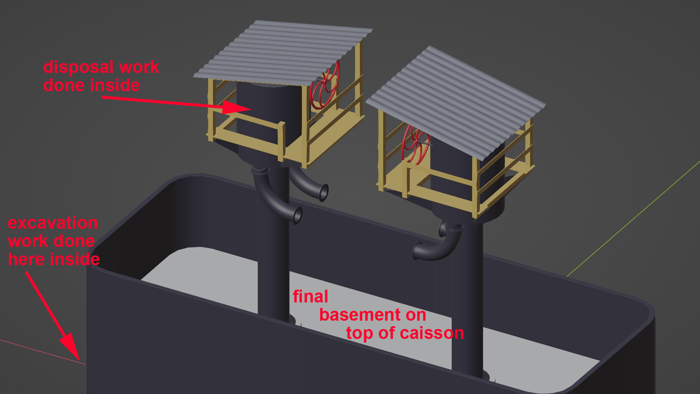 To prevent underground water from flooding they used comprimed air - that means the whole system (black elements) had to be overpressured. Even the circular tubes for discarging the soil were closed mainly.