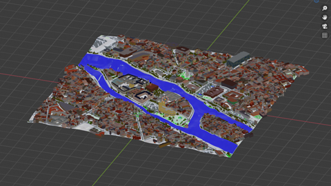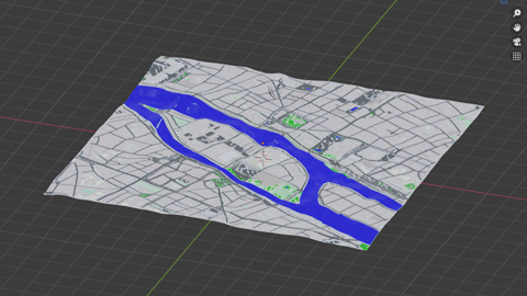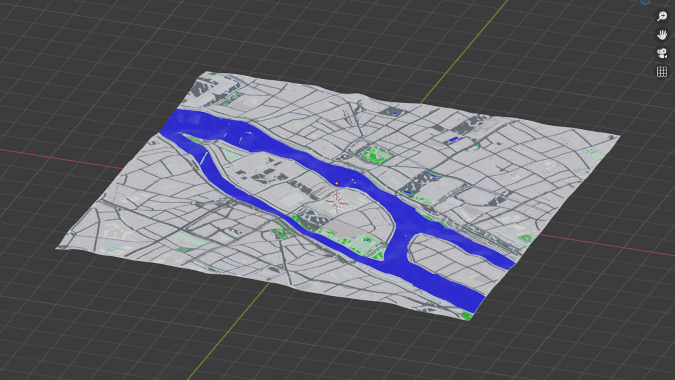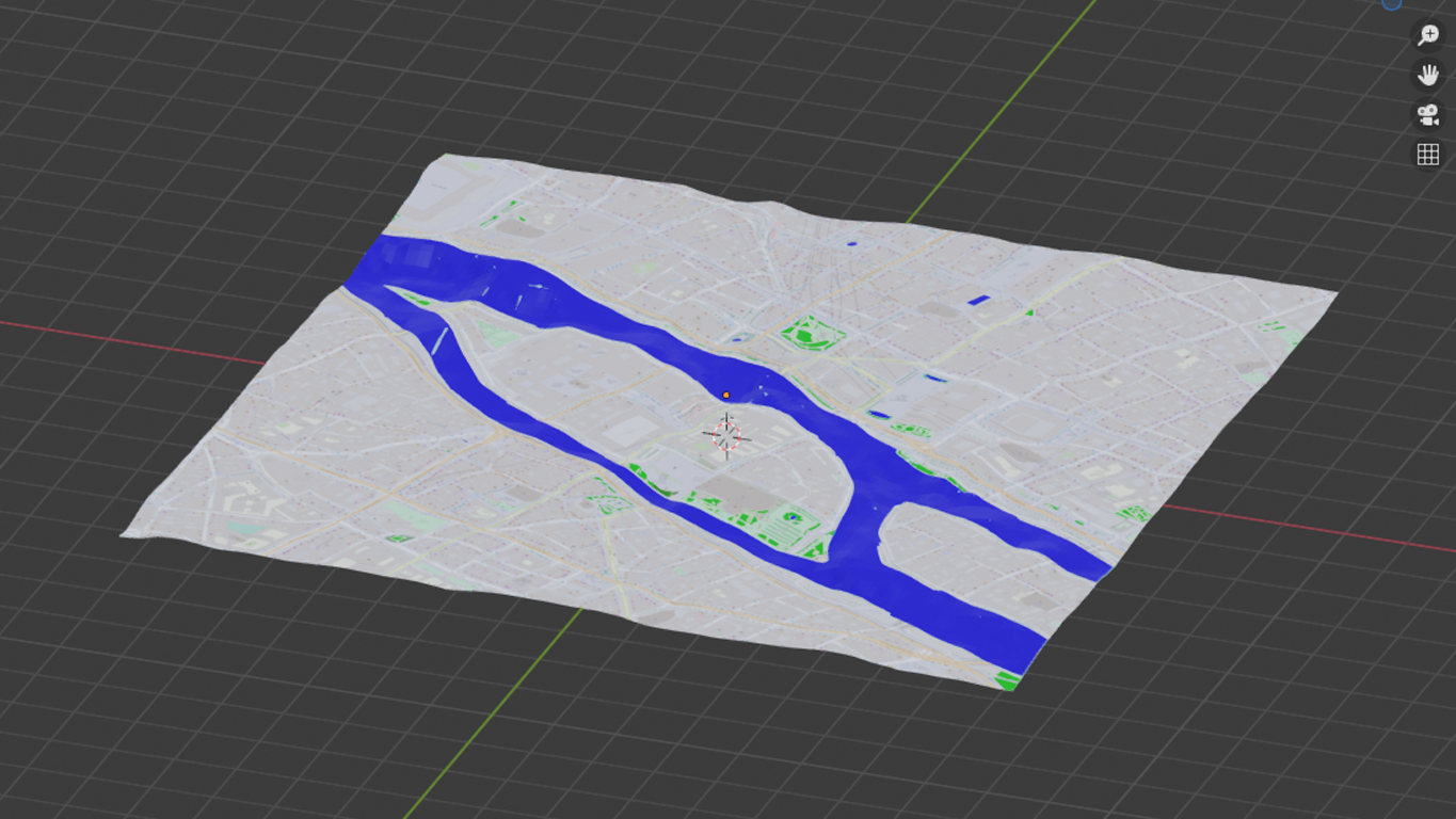 First to say is that areas for grass, forests, water a.s.o. are simple planes, subdivided and shrinkwrapped onto the surface. Generally speaking I think it's a smart idea to have forests or grass areas being seperate meshes (should make it quite easy to work with particles e.g.), but unfortunately it doesn't fit to the way water behaves. Of course it's a handy method which should give convincing results as far as background is concerned, but I guess I'll have to do some manual work to define the rivers Seine and Marne.