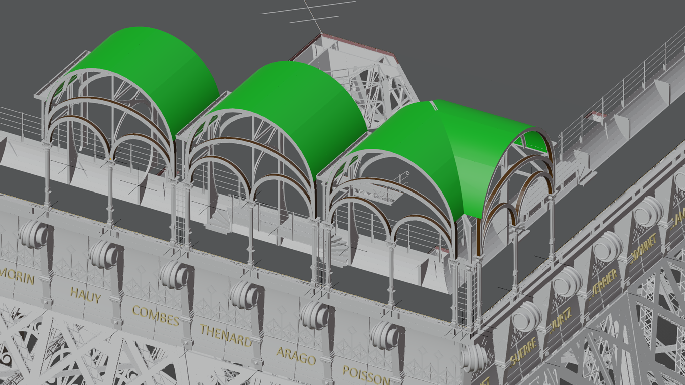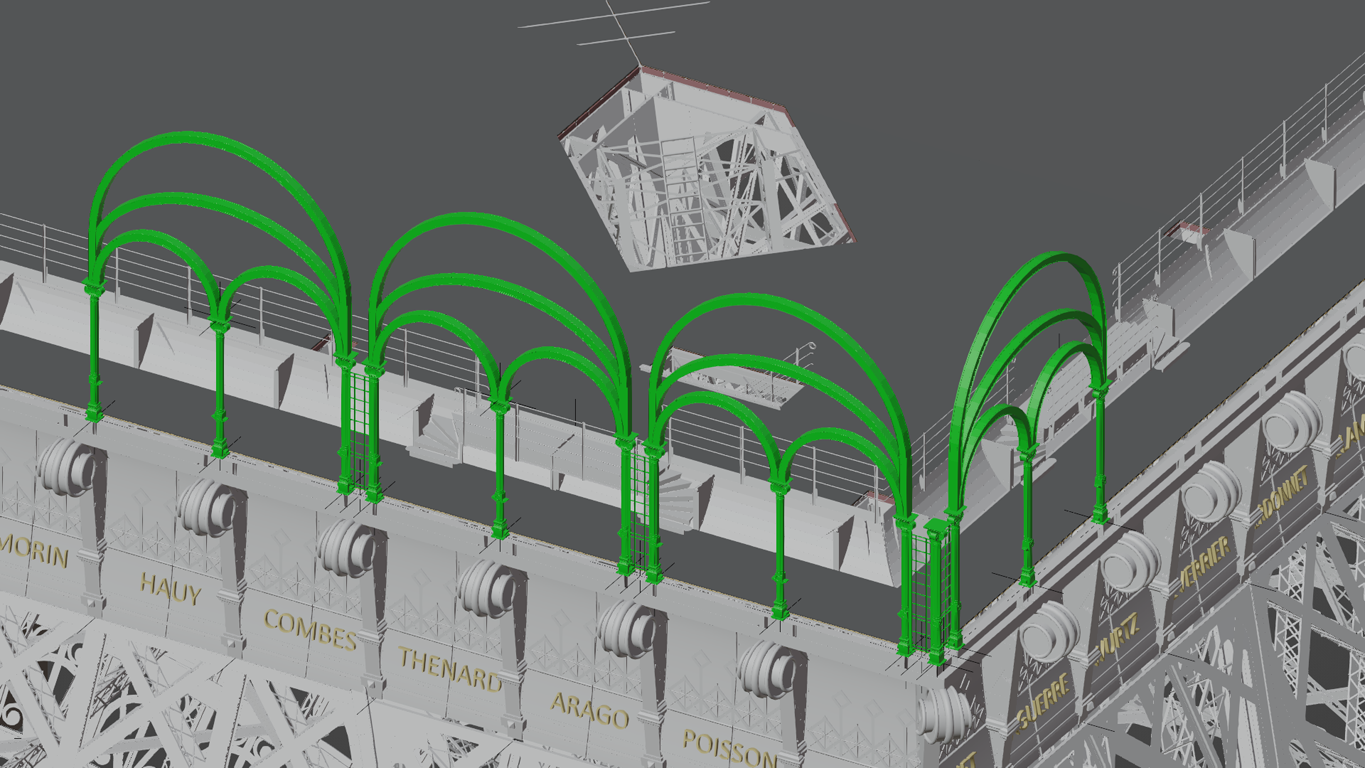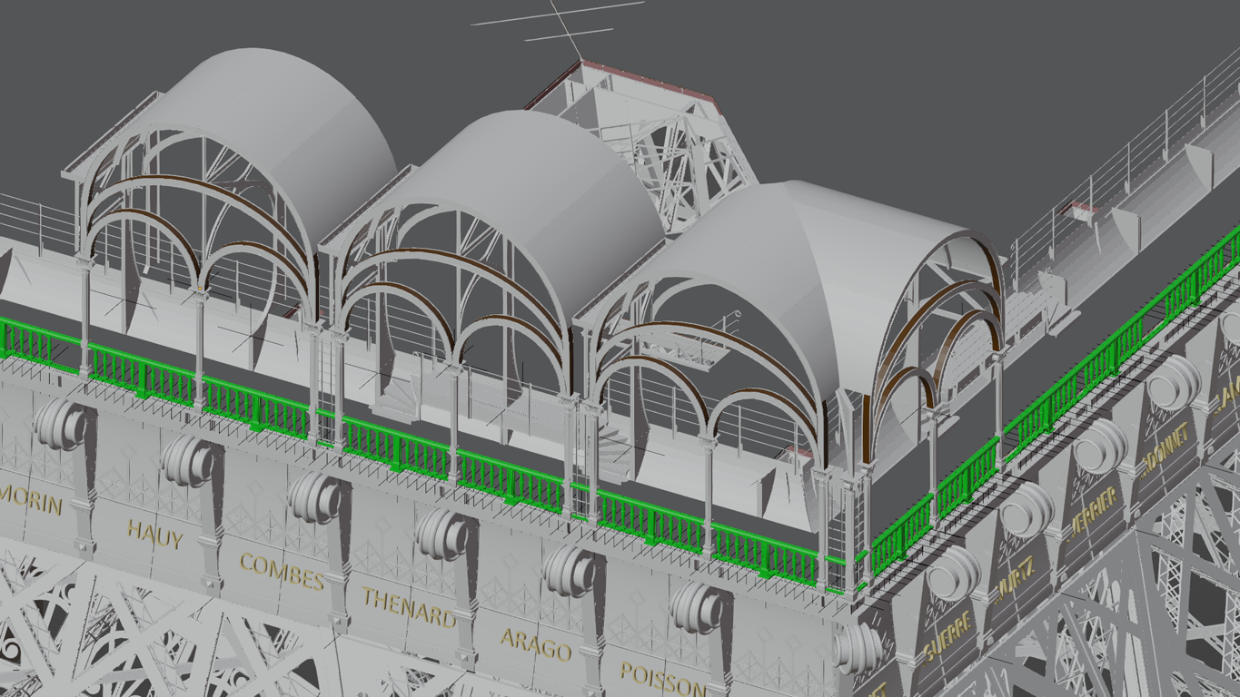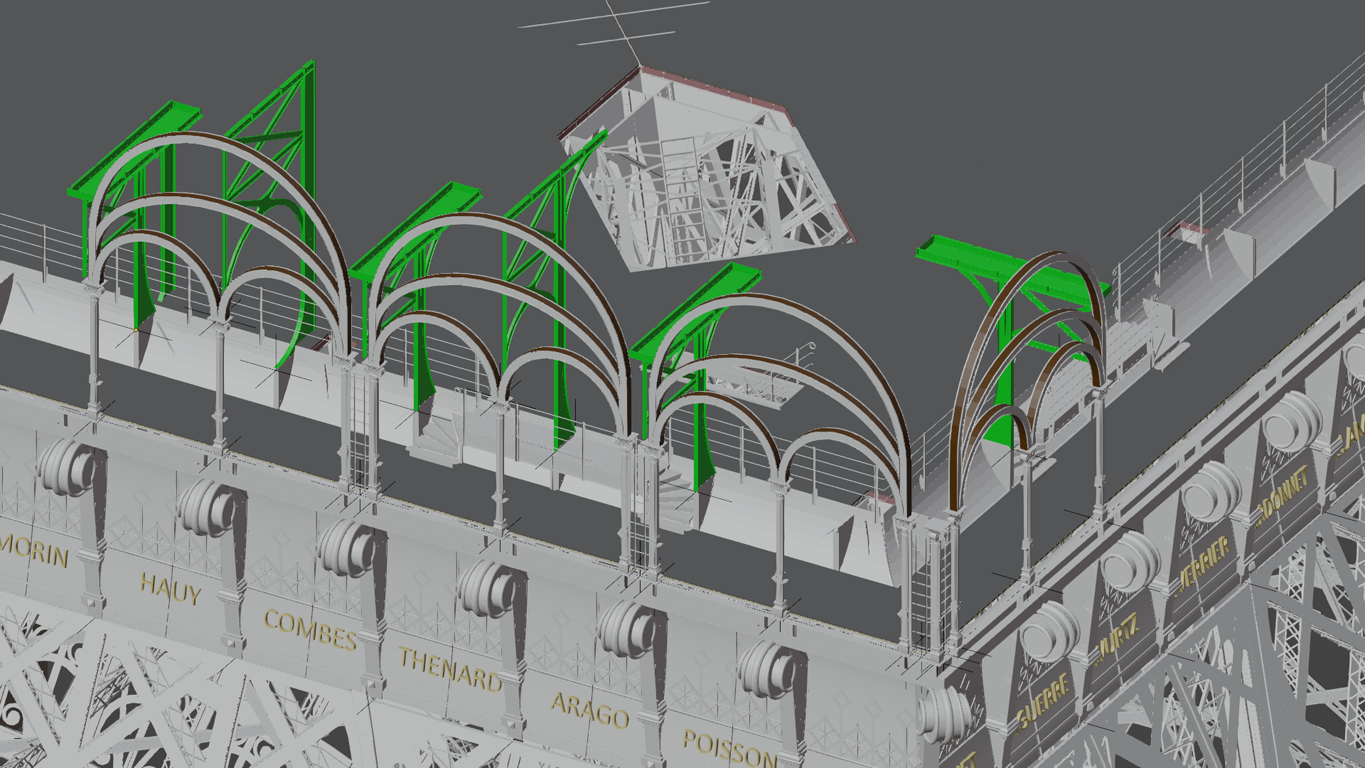 The gallery is attached to Panneau 5 resp. the Grand Poutre and surrounds the Tower's first floor: