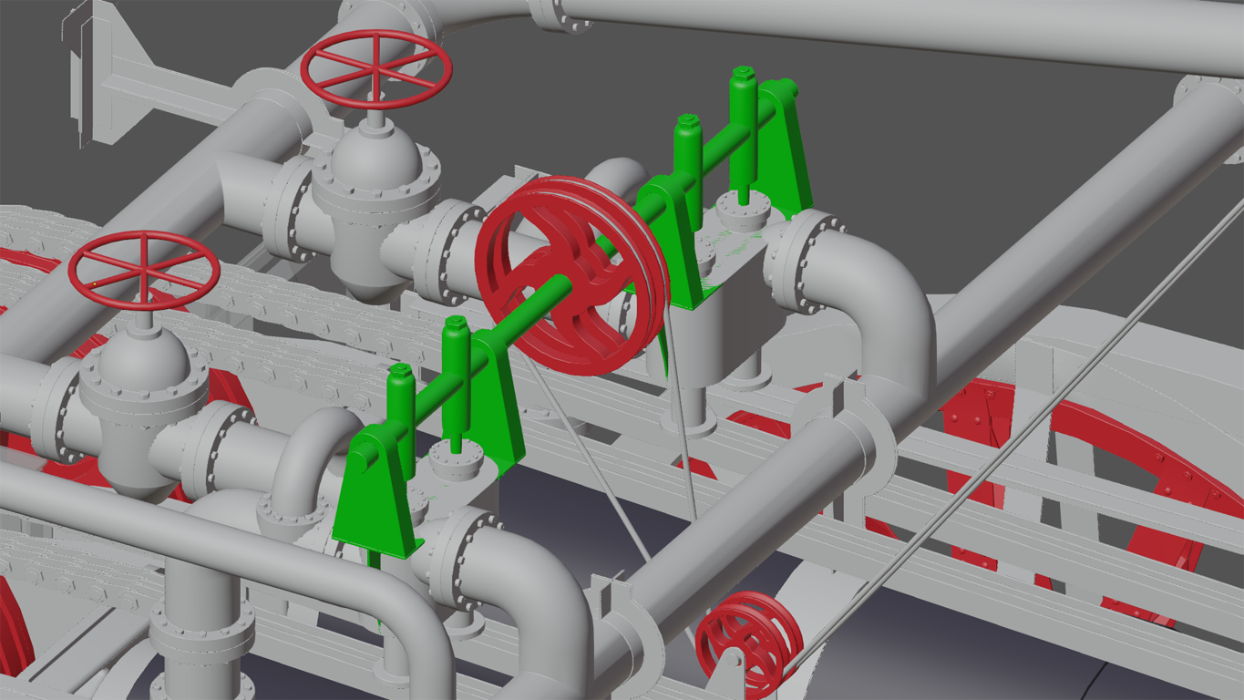 The cables then were led to an axis carrying a system of levers which opened some of the valves, closed some others and thereby regulated the water streaming in or out the hydraulic cylinders: