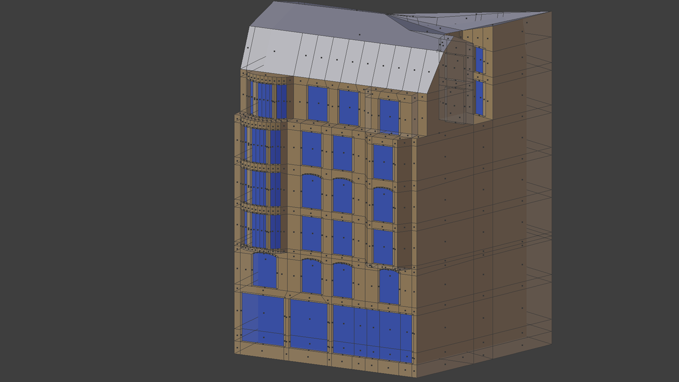 7. Window frames are easily done from doubled window faces, subdivided as needed and having some "body" either by the use of Wireframe or Solidify modifier: