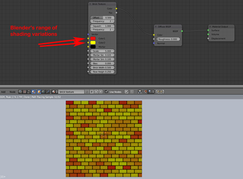 Blender's Brick texture offers some variations by itself, producing different shaded stones within the surface: