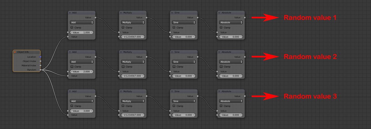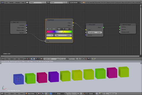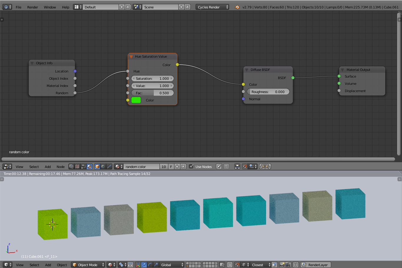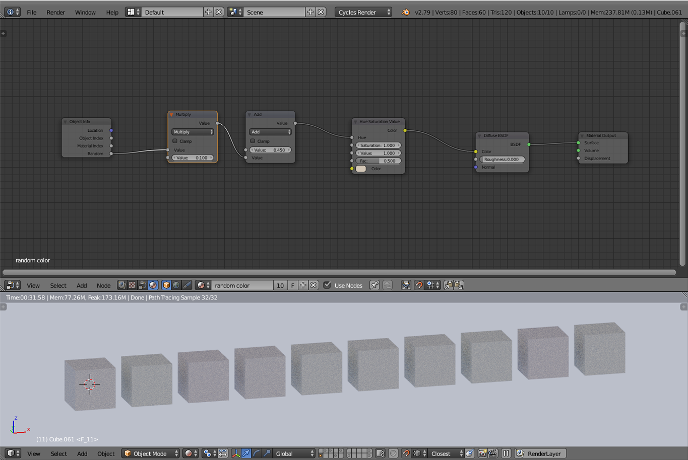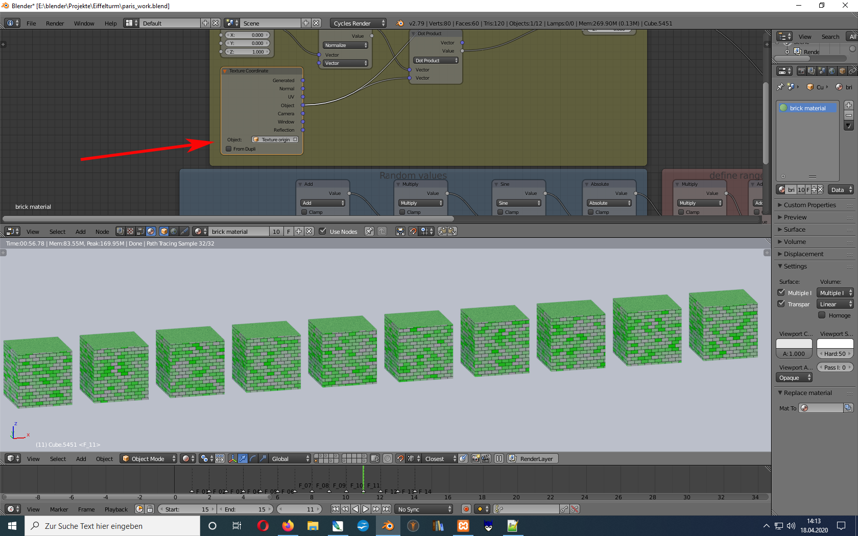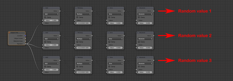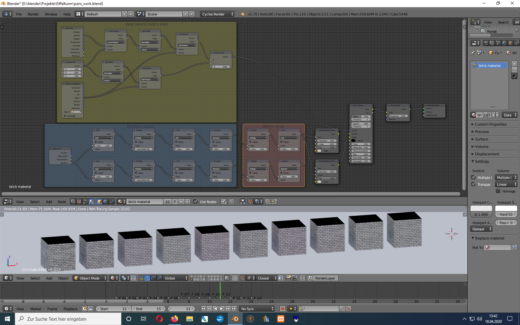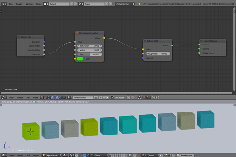 Back to my brick material: I use one random value with the afore mentioned settings for shading variations from one cube to the other, and a second random value for variations within the cube. Therefor I use the same basic color but modify HSV "Value" to get some slightly darker stones:
