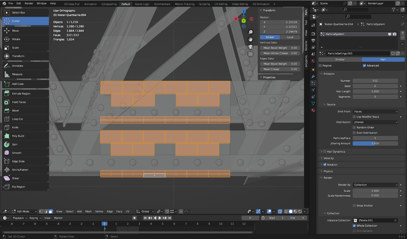 And there's another great advantage: Using array modifier would have afforded one rivet for each array (which in the end could have been some thousand single rivets), but for all the particle systems I need one single rivet.