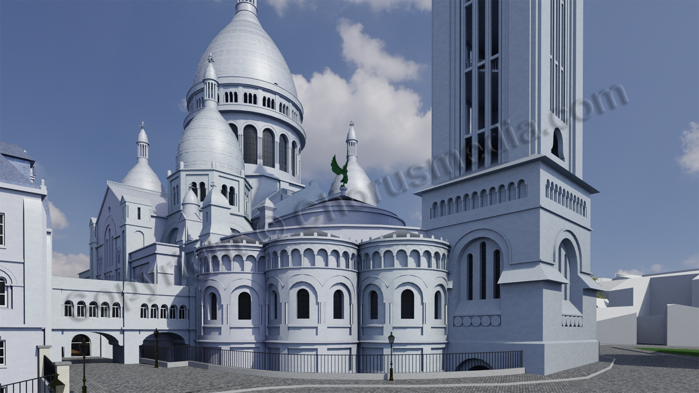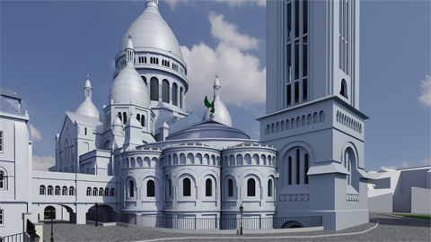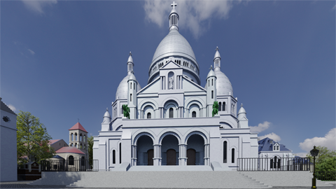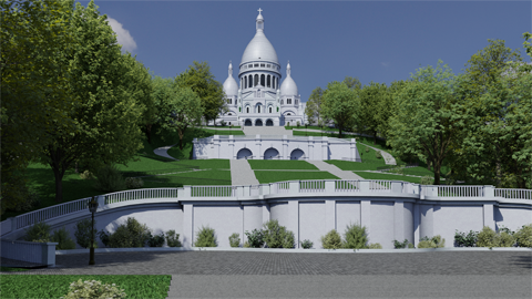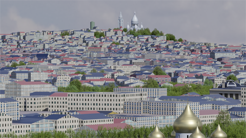 Honestly speaking I'm not absolutely convinced. The camera is still far too distanced to show Sacre Coeurs lovely details, but at the same time the schematized OSM houses are dragged into foreground. I think the above shown clay renders do a better job to present the Cathedral...