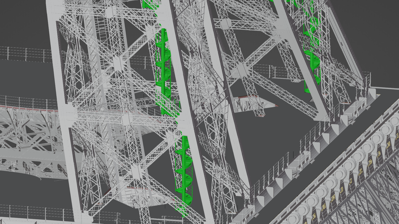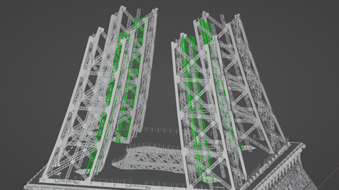 Like below each leg includes some rails for the elevators, although only two of the elevators (North and South pillar) lead up to the second floor: