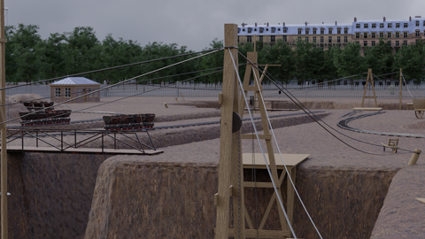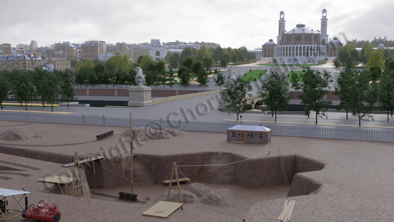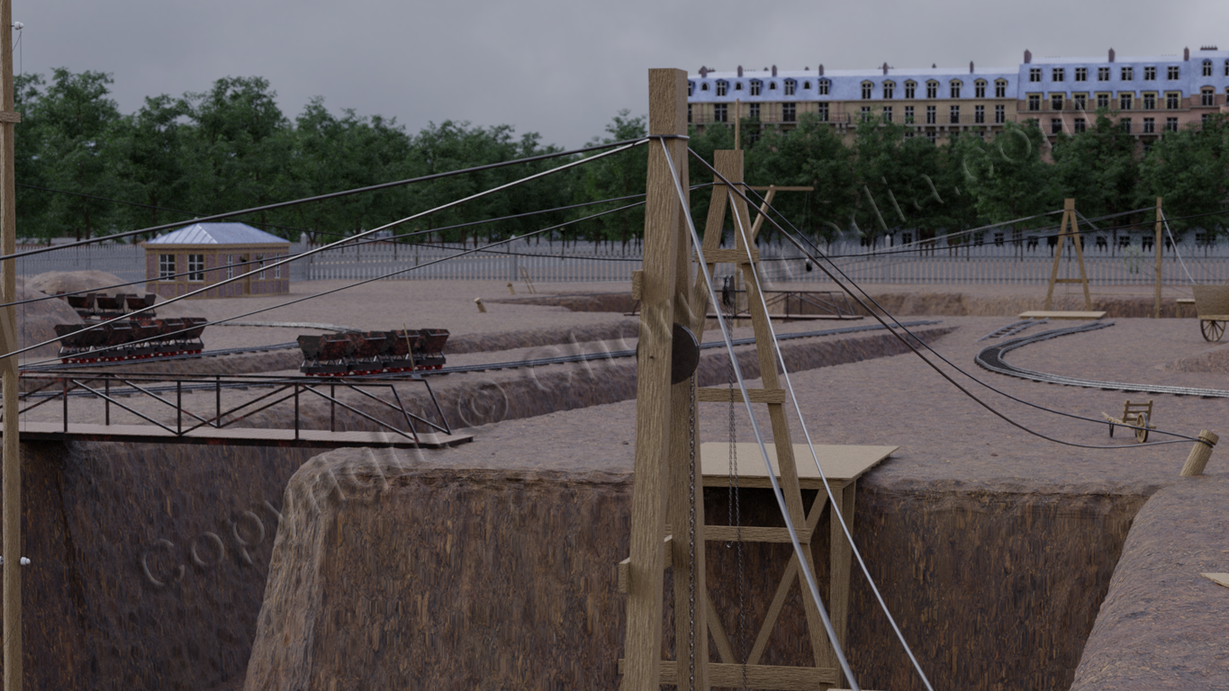 Seemed to be funny times: they had electricity (Paris' street illumination switched to electricity in 1878 already) and comprimed air (1863: first submarine in the French Navy), on the other hand digging was done by manual power. Even cranes and pulleys were driven manually, and the small lorries were pulled by horses.