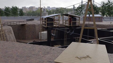 Next step was building the basements for the main piles at the corners of each pillar. This seemed to be really hard work - at least for the Northern and Western pillar. The ground was all wet, and they had to deal with underground water, so they used some caissons for the work. The caissons had been filled with comprimed air to keep the water outside, and the workers had to do their job in a permanent atmosphere of overpressure.