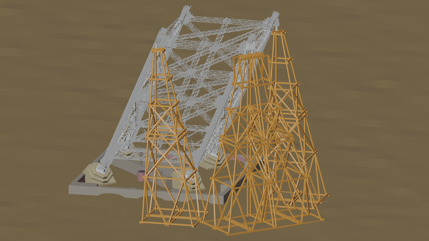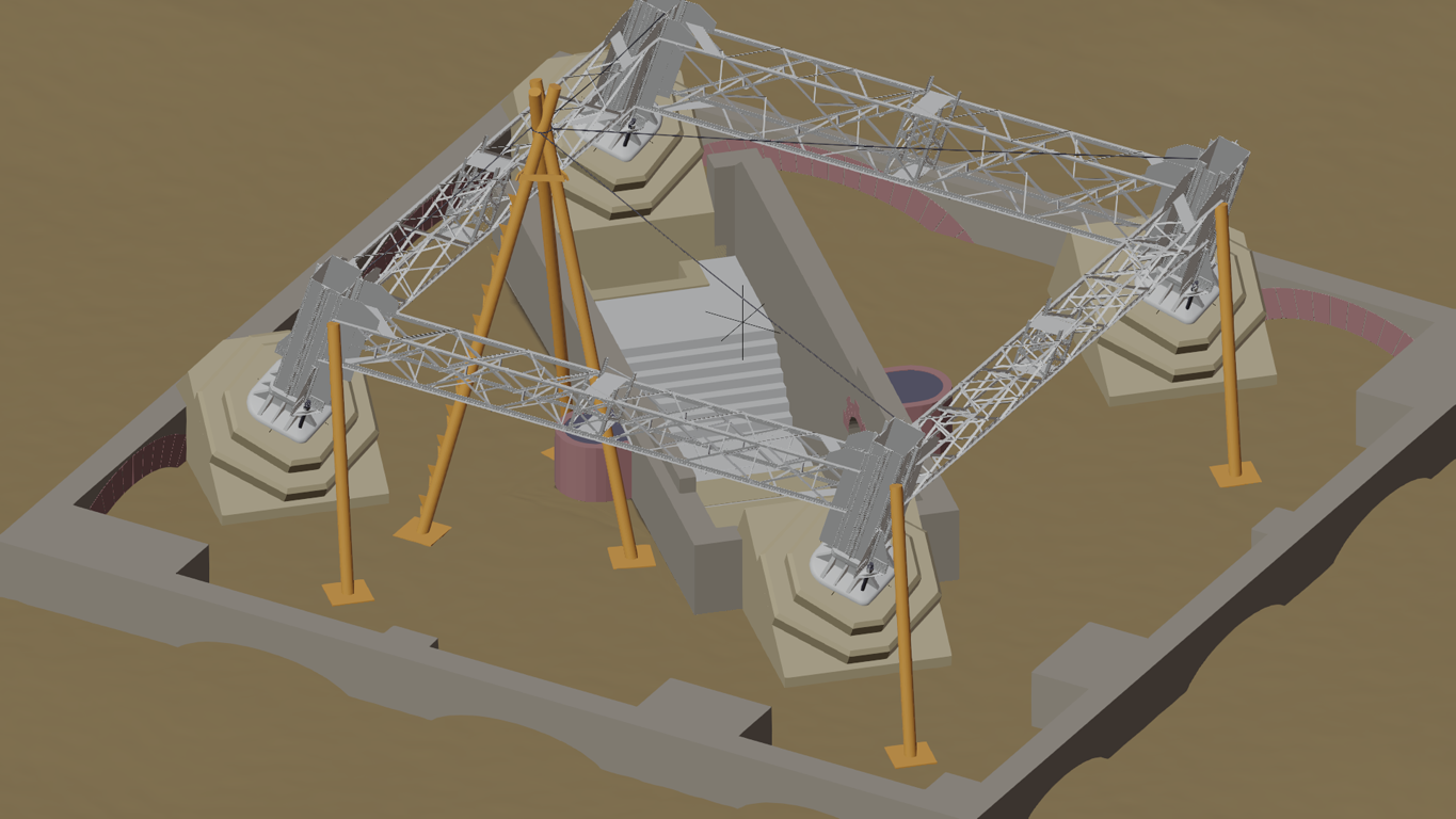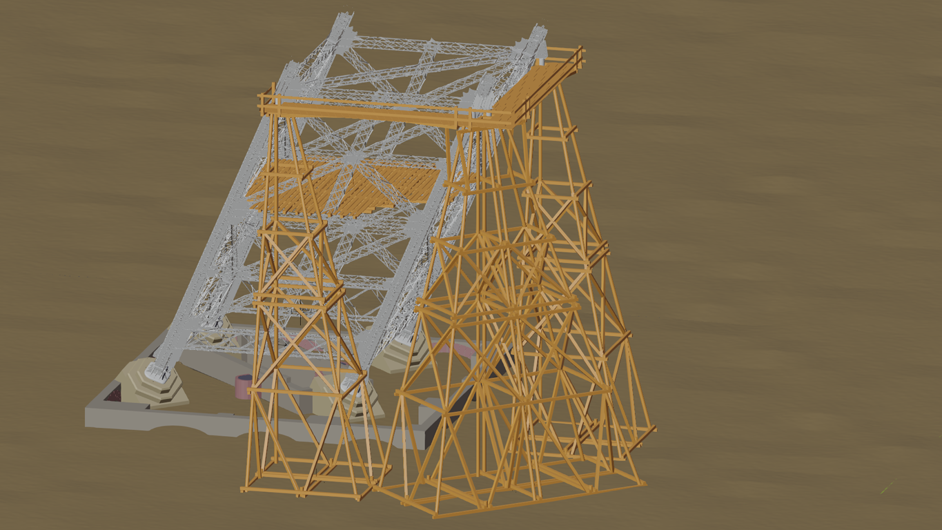 Those structures ("Pylons") had their place until the 1st floor was finished. They had been fixed to the Arbalétriers by some quite complicated structure. Being an architectual and technical amateur I wasn't able to understand the drawings completely, but that's how they looked (green parts):