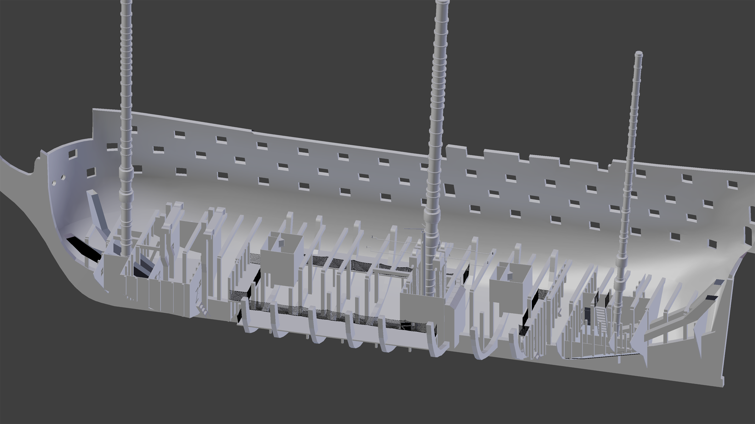 I don't guarantee for historical correctness here - the hold turned out to be less documentated than the other parts of the ship (understandably - most tourists prefer taking pics of dangerous looking gun decks or the luxury of the captain's cabin). I followed McKays drawings as far as possible and added some details (doors, stairs a.s.o.) being logical to me.
