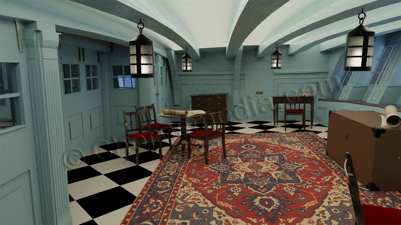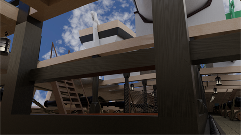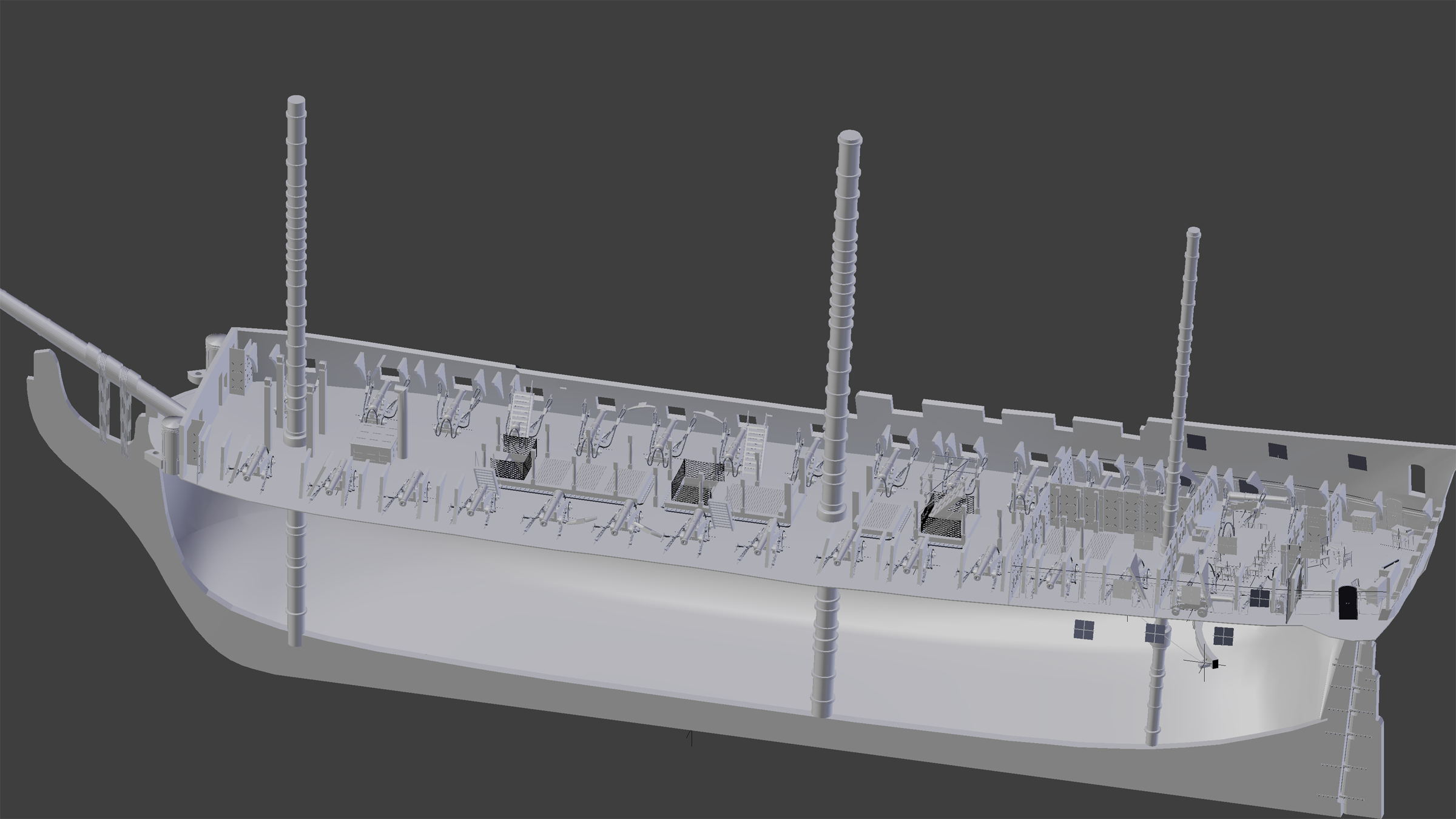 Carrying some 12 lbs guns. The part of the ceiling being open is called waist and was used mainly to store goods inside the ship.